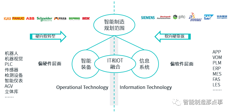 我们按照传统制造企业业务主体责任划分,把智能制造相关领域的工作范畴划分为两类,一类是InformationTechnology(简称IT), 一类是Operational Technology(简称OT)。