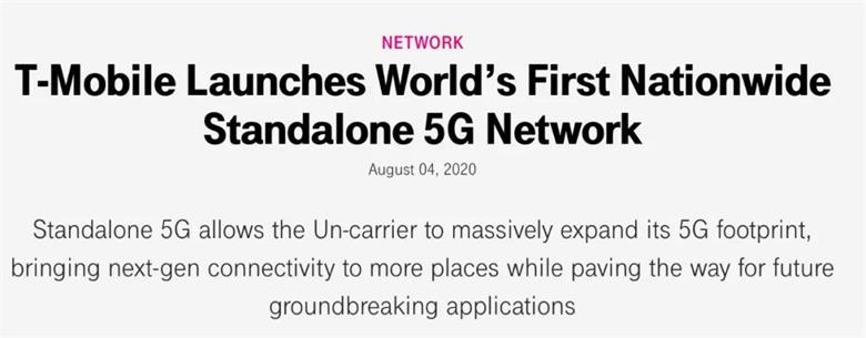 8月4日,美国运营商T-Mobile宣布推出全球首个全国性覆盖的SA(独立组网)5G商用网络。