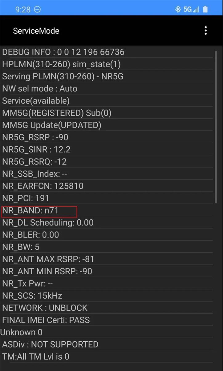 从测试参数看,这是一张基于600MHz(也就是n71频段)的5G SA网络。