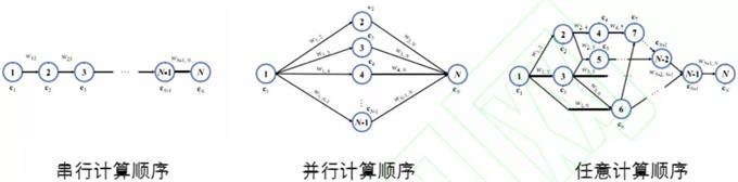 1)计算任务模型:总的来说,MEC 的计算卸载模型包括全部卸载和部分卸载。其中,全部卸载计算模型适用于数据不可分割的高集成计算任务,它要求用户只能选择全部本地计算或者全部卸载到 MEC 服务器。这类计算任务的关键参数包括:计算数据量(比特数)、计算强度(每比特数据需要的中央处理器时钟数),以及计算时延要求。这些参数与具体的计算任务相关,可以通过对计算任务的剖析和建模得出。另一方面,部分卸载模型适用于两类计算任务:一类是数据可任意分割的计算(如数据压缩等);另一类是包含多个子任务的计算,不同任务间往往具有一定的运算顺序和联系,如图2所示。与全部卸载模型相比,部分卸载模型有更多的设计自由度,可以更有效地卸载部分数据或子任务来减少用户的计算时延和能耗。