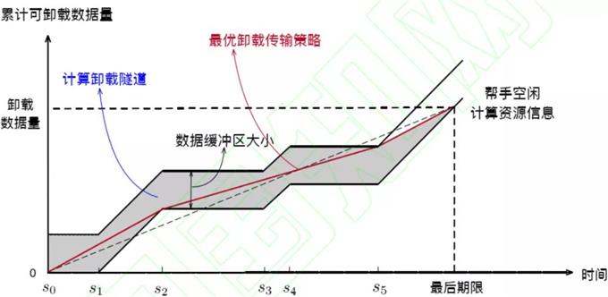 与基于边缘基站的 MEC 系统相比,用户周边的移动设备(简称帮手)呈现出时有时无的空闲的计算资源。这是因为帮手只有在自己没有计算任务时,才能给周边的用户提供空闲的计算资源。利用这个特性,我们提出了一种基于帮手空闲计算资源的变速率计算卸载算法。该算法的核心在于首先在以横坐标为时间、纵坐标为累计可卸载数据量的坐标轴上构建一个“计算卸载隧道”,隧道的顶部和底部形状与帮手的缓存区大小和空闲计算资源的存量有关,具体如图 3 所示。