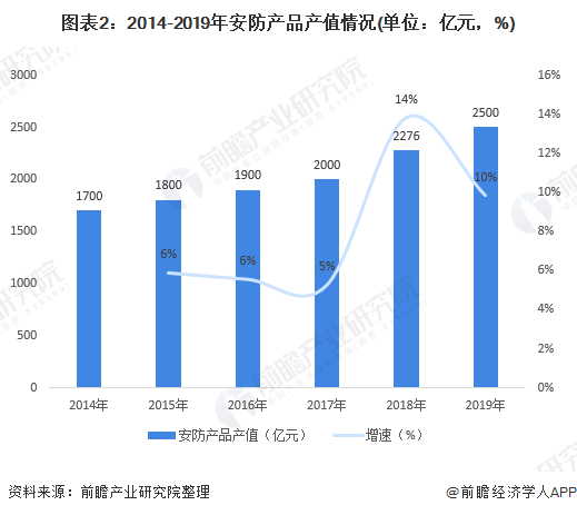 在政策红利之下,我国安防产品产值不断增长。安防产品包括监控、防盗报警、交通安全、安全检查、防伪技术、门禁考勤、安全防护产品等。2019年我国各类安防产品产值达到2500亿元,同比增长10%,占整个安防行业产值约为30%。随着人工智能、信息化技术的发展,安防产品也愈发智能化、智慧化发展。