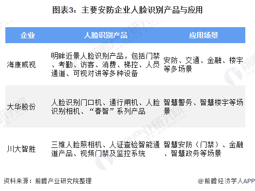 在国家政策驱动下,以及人工智能、IoT、5G等新兴技术的驱动下,安防行业保持稳定增长,维持着较高的景气度。同时行业新兴产品技术不断得到创新,行业企业在安防产品和应用场景上不断拓展。人脸识别,作为一种重要的个人身份鉴别技术,在安防、金融、交通等领域有着广泛的应用。在安防领域,海康威视连续8年蝉联全球视频监控市场份额第一,是实至名归的全球安防龙头。其人脸识别产品同样不断发展,海康威视人脸识别产品主要为“明眸”系列近景人脸识别产品,广泛应用于安防、交通、金融服务和楼宇等场景;大华股份作为安防巨头之一,其推出人脸识别门口机、通行闸机等产品,应用于智慧警务、智慧楼宇和日常消费场景。川大智胜以实时软件为核心,形成系列重大装备和系统,在人脸识别领域推出了人证查验通道产品、视频门禁监控系统等,广泛应用于企业。