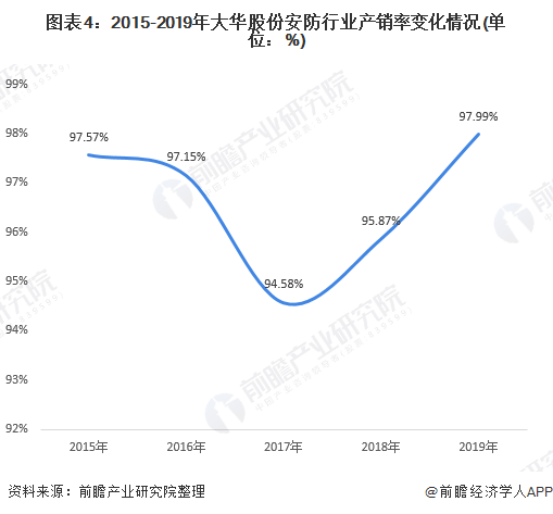 安防行业在产品不断创新,技术不断突破的情况下,市场销售反馈良好,以大华股份公司为例,2017-2019年大华股份安防行业产销率持续上升,销售形势持续利好。