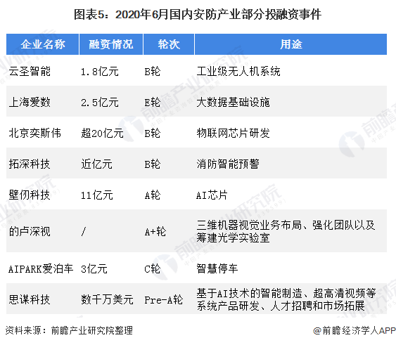据不完全统计,2020年6月智能安防领域投融资事件逾20起,涉及金额超百亿元。2020年6月安防产业部分投融资事件包括云圣智能完成1.8亿元B轮融资;上海爱数完成2.5亿元E轮融资等。