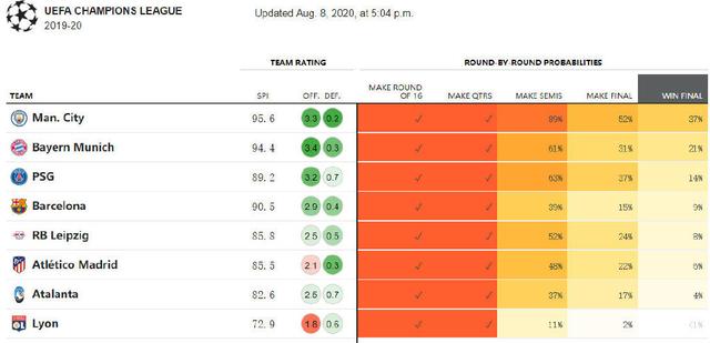 本赛季欧冠联赛进入到了最后的八强战,8支球队谁会成为最后的冠军呢?在欧冠八强全部出炉之后,知名数据分析网站根据大数据分析,计算出了各支球队本赛季欧冠的夺冠概率。从这份预测的情况来看,曼城和拜仁两支球队,无疑是最被看好的。而拥有梅西的巴塞罗那队,则不被看好。