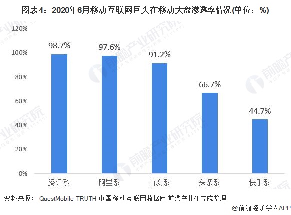 目前,腾讯、阿里、百度、头条和快手占据我国大部分移动互联网市场。腾讯系、阿里系和百度系在移动大盘渗透率均达到90%以上。头条系和快手系渗透率分别为66.7%和44.7%。