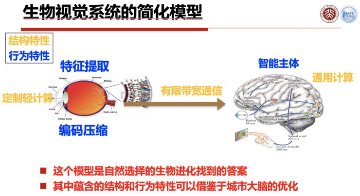 城市大脑1.0是一个以云计算为核心的系统,由于系统各个部分分工协调不太好,所以系统成本比较高,响应速度慢,数据的可利用度比较低。借鉴人的视觉系统,比如说人的视网膜、视觉通道、大脑分工非常协调,非常合理。