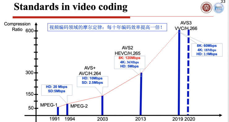 最近开始使用H.265或者AVS2的标准,未来不久就会用上H.266和AVS3的标准,这个标准差不多每10年就会更新一代,效率每10年就会提高一倍。