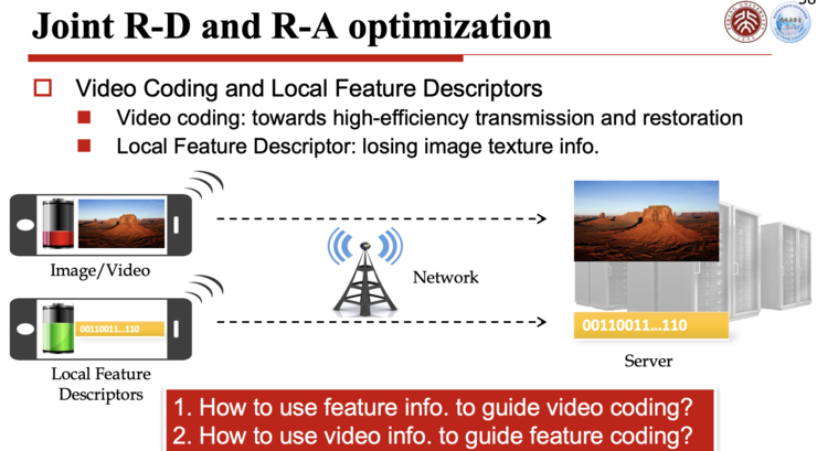 所谓联合优化,就是在视频编码和特征编码之间,要找到一个最优的结合点,使得这两个流捆绑到一起的时候,脑力分配是最优的,上面这个流是视频压缩流,下面这个流是特征压缩流,这样送到云里,它俩合起来是最优的。