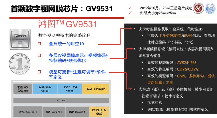 上面这些使能技术,最后它要汇总到一个芯片里面,这个芯片现在在北大杭州研究院下面的一家公司做出来了,第一个数字视网膜的芯片叫GV9531,刚才的8个特性,这个芯片全都是支持的。