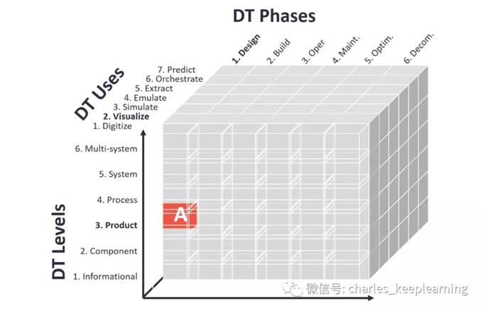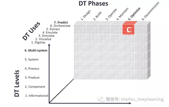应该注意的是,可以增加第四个维度来描述数字孪生用例中使用的数据类型。一个人可以利用实时数据,历史数据或简单地测试数据。为了简单起见,这没有可视化。