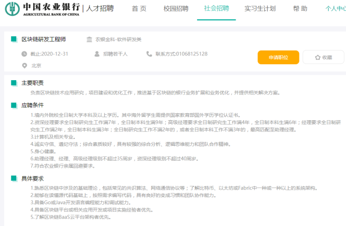 根据公告显示,农行金科的的业务方向主要是运用金融科技手段,开展技术创新、软件研发、产品运营与技术咨询。而在农行金科发布了招聘公告中,笔者发现软件研发中有一项职位为:区块链研发工程师。