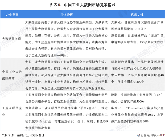 目前,中国工业大数据行业竞争格局呈三级梯队分布,不同梯队内的企业专注领域不同,各具优势:大数据龙头企业综合实力强劲,工业大数据服务商在垂直领域的专业度较高,工业互联网企业依托流量优势布局大数据服务细分市场。