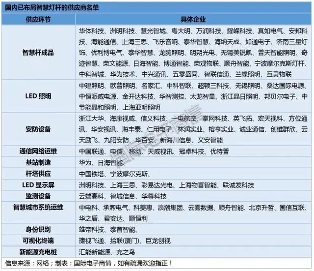 目前进入智慧灯杆领域的企业主要有以下几种类型:路灯企业、路灯杆企业、控制系统类企业以及通讯类企业,生态链上各类相关企业积极跨界,瓜分智慧灯杆发展的红利。智慧灯杆领域未来可能吸引更多领域的企业跨界布局,企业类型更加多样化,如显示屏企业、充电桩企业等。