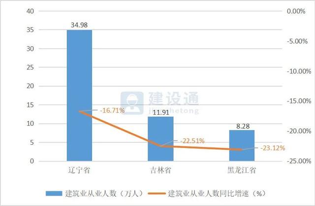 黑龙江从业人数大幅减少。2020年第一季度,东北地区建筑业从业人数超过10万的地区有2个,同比去年减少1个。辽宁、吉林、黑龙江从业人数分别为34.98万人、11.91万人、8.28万人。与去年同期相比,受疫情影响,东北3个地区的从业人数均减少,降幅均超过了10%。