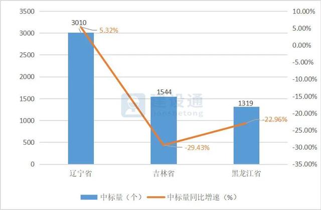 2020年第一季度,东北地区平均中标量为1958个,东北3个地区仅辽宁地区的中标量高于此平均值达到3010个,同比去年增加了5.32%;吉林中标量为1544个,同比去年降低29.43%;黑龙江中标量为1319个,同比去年降低22.96%。