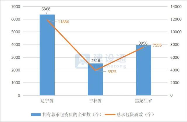 辽宁拥有总承包资质的企业数最多。截止目前为止,东北地区拥有总承包资质企业的3个省份数量分别是:辽宁6368家、吉林2516家、黑龙江3956家。其中辽宁拥有总承包特级企业15家,总承包特级资质数量21个。吉林拥有总承包特级企业6家,总承包特级资质数量6个。黑龙江拥有总承包特级企业4家,总承包特级资质数量4个。