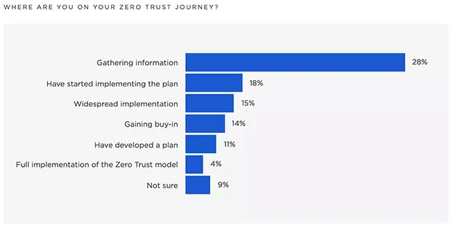 这些领导者中有超过四分之一开始了零信任计划或部署过程。简而言之,接受调查的组织中只有9%的组织都在以某种方式努力实现零信任。
