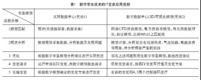 IT变更是运维工作中每天可能发生的事件,目前很多数据中心在进行IT设备变更的时候仍是比较盲目,往往根据经验进行,而数字孪生模型将可以终结盲目。表1给出了数字孪生技术的IT变更应用流程。