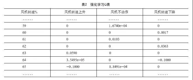 表2为强化学习的Q表,第1列风机转速输出,第2-4列为Q值,Q值大的地方为优化后的转速,从表2中可以看出空调风机最优转速输出在60%~63%之间。