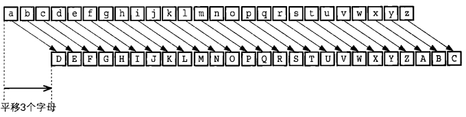 现在我们将字母表平移3个字母,于是,明文中的a在加密后就变成了与其相隔3个字母的D,以此类推。b变成E,c变成F,d变成G......v变成Y,w变成Z,而x则会回到字母表的开头而变成A,相应地,y变成B,z变成C。通过下图我们可以很容易地理解“平移"的具体工作方式。