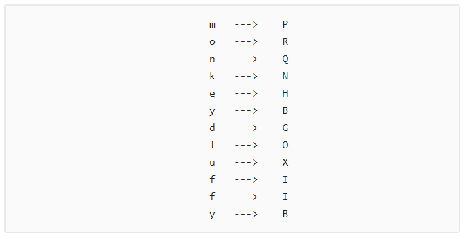 此时,明文包含下列12个字母:monkeydluffy, 接下来我们对明文中的字母逐一加密: