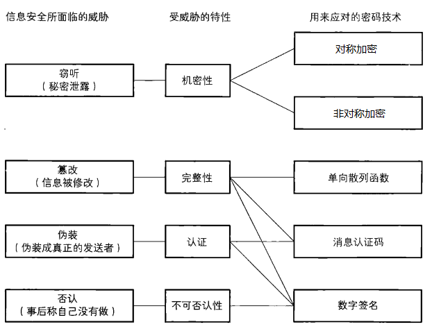 我们将信息安全所面临的威胁与用来用对这些威胁的密码技术直接的关系用一张图标来表示出来。
