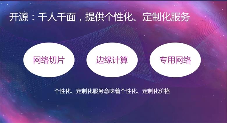 首先,开源方面,我们需要去思考5G在哪些方向的应用可以创造更多利润。如果提供的是通用的或同质化的产品,其销售最终往往会陷入价格战,但是当企业提供千人千面的个性化定制服务时,企业就可以按照个性化需求收取不同等级的费用。5G的开源就应该为个人用户和企业用户提供个性化定制服务做起,我认为可以通过很多技术或商业安排来实现,这里分享其中三个方面:第一是网络切片,第二是边缘计算,第三是专用网络。当然,个性化、定制化的服务就意味着个性化、定制化的价格,这就是提升5G收入的重要手段。
