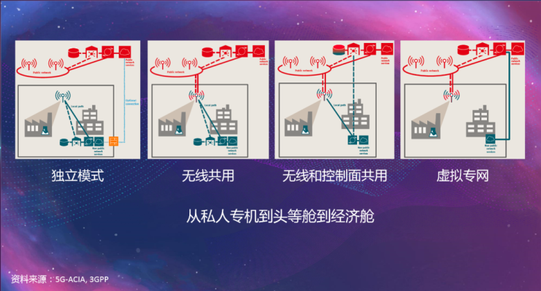 例如,三种混合型专网:第一种是无线共用型;第二种是无线侧和控制端共用;第三种就是最简单的专网,也可以称为网络切片。可以看出,5G专网为用户及企业提供了从最豪华到最经济的不同选择,可以类比成私人飞机、头等舱、经济舱、廉价航空的各级服务,当然也对应不同的价格。