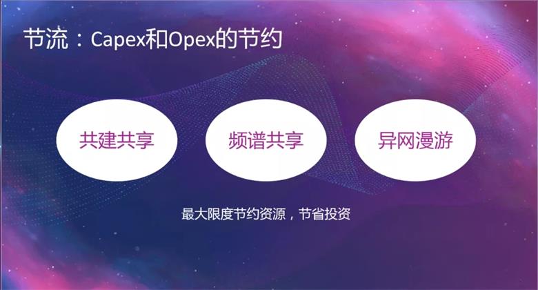 接下来和大家分享5G的节流。节流的关键词是共享,通过共享各类基础设施将有限的资源最大化利用,降低各方面成本。众所周知,5G的建设和运营中,最重要的两类成本就是Capex和Opex,即资本性支出和运营支出,5G的节流就是通过各种手段来降低这两方面的成本。我主要想和大家分享三个关键词:共建共享、频谱共享、异网漫游。
