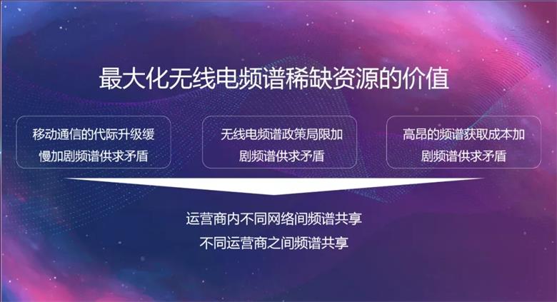 众所周知,无线电频谱是移动通信中最稀缺的资源之一,所以只有通过共享才能将稀缺资源的价值最大化。无线电频谱共享的原因有三:首先是移动通信的代际升级缓慢,加剧了频谱供求矛盾。目前,2G、3G正在退网,但其实5G已经开始商用了,我们面临的是 2G、3G、4G、5G的“四世同堂”网络结构,2G占用了大量的优质频谱资源,如果无法完全退网就很难腾退频谱资源。