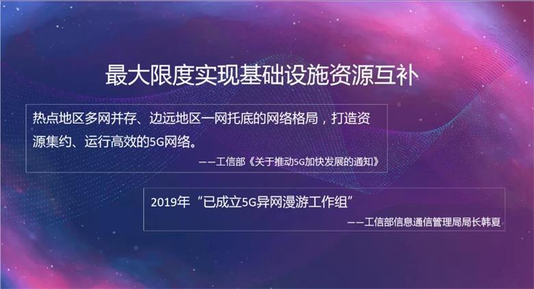 目前也有很多政策支持异网漫游,今年3月份由工信部发布的《关于推动5G加快发展的通知》里提到:开展5G网络共享和异网漫游,热点地区多网并存、边远地区一网托底的网络格局,打造资源集约、运行高效的5G网络。去年年底,工信部信息通信管理局局长韩夏在总结工作时提到:“工信部已于2019年成立5G异网漫游工作组”。相信在政策及运营商成本节约需求的驱动下,异网漫游在不久的将来可以实现商用。