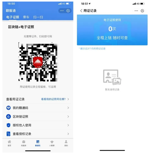 江西—「赣服通」3.0版:借助大数据和区块链等新兴信息技术为支撑,利用区块链技术的不可篡改、可追溯和智能合约等特点,保障数据同源性、功能同步性,以此推动一批事项实现在手机端「不见面审批」、推动一批服务实现「无证办理」,发挥区块链技术在数据共享复用、业务协同处理等应用场景的效用。并且在全省一体化在线服务平台等的支撑基础上,通过人脸识别认证和信息授权服务,实现自动调取、使用相关的证照数据,甚至自动生成办事材料,使得「区块链+电子证照+无证办理」的应用模式得以实现,达成构建可信的政务环境和提高政务服务效率的目标。此外,用户还可以查看授权记录和用证记录,让用户安心「授权」!