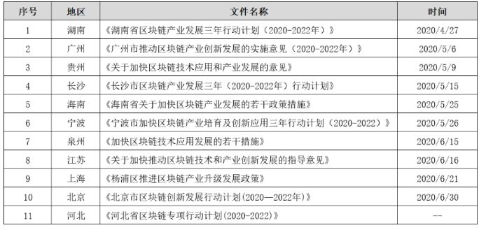 此外,2020年上半年全国已有贵州、湖南、广州、宁波、长沙等多个省市相继发布区块链发展行动规划或区块链专项政策,其中湖南、贵州、海南、北京和河北出台涉及区块链专项发展政策,从各地出台的区块链政策中可以看出,金融、政务、跨境电商领域或许将成为区块链发展的重点领域。