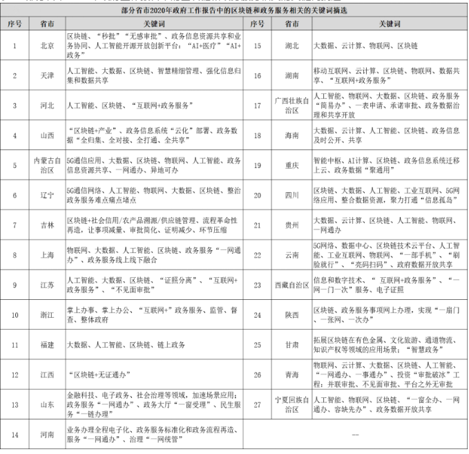 表1:部分省市2020年政府工作报告中的区块链和政务服务相关的关键词摘选