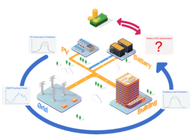 智慧园区分布式能源“风、光、储”中,通过储能或者园区内其它节余能源起到调节作用,帮助平衡能源,动态优化。基于超短期负荷预测和多能互补优化算法模型的仿真评估,开展最大需量(峰值负荷)影响因素预测分析,可以提供合理的分布式能源设施规格、数量规划建议,以提高能源站运行经济性(见图 2)。同时根据基于精准负荷预测的 AI 算法,对各能源子系统进行深度节能优化的策略,进行实际能源侧和需求侧配合的场景模拟。例如:根据历史用电信息,光伏发电量预测信息、储能系统 BMS 信息,用户行为分析、地区经济发展规划进行数据聚合与预处理形成多能互补优化算法模型;根据园区各系统负荷季节特征、工作日 / 非工作日、节假日、年负荷、季度负荷、月负荷、日负荷、逐时负荷预测负荷周期,建立算法模型;园区电动汽车充电桩作为用电负载,可通过有效的分时充电管理起到发电和用电优化配比的调节作用。根据整个园区规划方案和实时数据采集建立的仿真模型,进行复杂和不确定场景的沙盘推演,得出最优配比策略作为能源最优经济性运行的决策依据,实现经济效益的最大化(见图 3)。