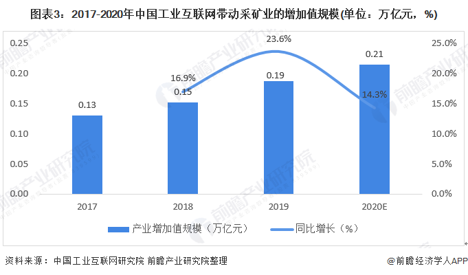 据统计,2017-2019年我国工业互联网带动采矿业的增加值规模呈逐年增长态势。2019年,工业互联网带动采矿业的增加值规模达到0.19万亿元,名义增速为23.6%。预计2020年,工业互联网带动采矿业的增加值规模将达到0.21万亿元。