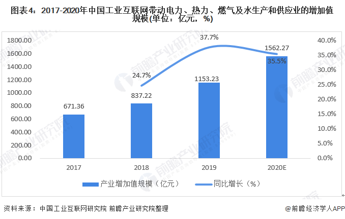 据统计,2017-2019年我国工业互联网带动带动电力、热力、燃气及水生产和供应业的增加值规模呈逐年增长态势。2019年,工业互联网带动电力、热力、燃气及水生产和供应业的增加值规模达到1153.23亿元,名义增速为37.7%。预计2020年,工业互联网带动电力、热力、燃气及水生产和供应业的增加值规模将达到1562.27亿元。