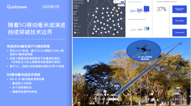 随着关口不断被迈过,毫米波的可行性日益明晰。今年2月,高通在美国圣迭戈市进行了5G毫米波OTA外场测试。为了考验毫米波调制解调器的性能,高通将手机放置于极具挑战性的环境中,例如人流量大且有人群阻挡的场景下测试。另一个极端测试环境是,将手机固定在无人机上,遥控无人机在园区内穿梭飞行。得益于高通波束管理算法,即使在以上种种极具挑战性的环境下,手机仍然能够保持高速网络连接。