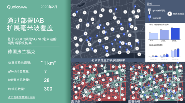 再用一个案例直观展示IAB的效果(如下图)。2020年MWC期间,高通在法兰克福市中心,约一平方公里的范围,部署了7个gNodeB,放了400个毫米波终端,并且我们在周围部署了28个IAB节点。对比图片下方的情况(绿色表示覆盖情况良好,红色表示覆盖不佳),相比无IAB,部署了IAB之后,整个覆盖范围明显增加,网络吞吐量也得到提升。