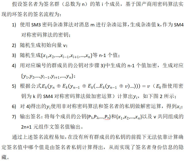 环签名方案同时应用了密码杂凑算法、非对称密码算法和对称密码算法,这些算法均采用对应的国产商用密码算法实现,在没有签名者私钥的前提下伪造签名值难度极高,安全强度非常强。