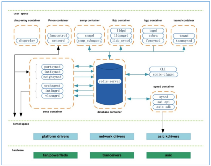 SONiC系统架构是以Redis为中心的基于数据驱动操作系统,SWSS,BGP等都是在Container里面运行。