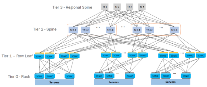 微软的架构, T0和T1主要是盒式交换机,T2和T3主要是框式交换机。第一步是在盒式交换机上完成了??SONiC的全面替代因为盒式交换机对比框式交换机更简单。