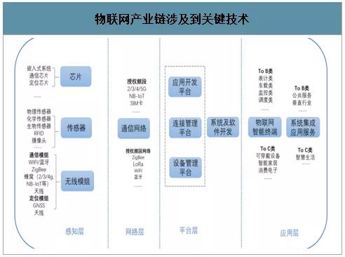 物联网产业生态可以划分成硬件、网络连接、平台及各领域的应用服务四个主要层次。其中,传感、模组等硬件是实现物联网运载功能的柱石,网络连接是基础,物联网平台是枢纽,而应用服务则是垂直行业拓展价值的出口。