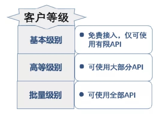 此外,还可以将客户划分为不同级别,级别不同费用不同。如基本级别的客户可以免费接入,但仅可使用有限量的 API;高级别客户可以使用大部分 API,超出部分另行计费;批量级别大客户,则可以使用全部 API。