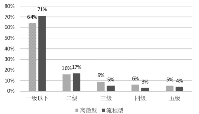 根据德勤《智能制造发展指数报告(2019)》显示,离散型智能制造成熟度要略高于流程型,特别对于成熟度在三级及以上的企业,离散型制造占比明显更高。离散型制造的产品由多个零件加工之后装配形成,这些加工程序往往互相离散并不连续,装备制造、船舶、汽车、电子电器等为代表的离散型制造多为大型企业,数字化基础牢固,本身整体实力较高,近年来在数字化向网络化智能化升级过程中做了大量尝试,智能制造成熟度更高。化工、炼油、水泥等一类的流程型制造在初级的流程化、自动化方面做得较好,但智能改造程度有待加深。