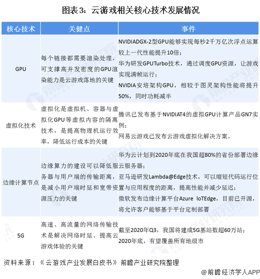 云游戏的发展从国外兴起,2009年,Onlive公司提出云游戏的概念,随后全球各大互联网厂商纷纷布局云游戏业务。2012年起,英伟达开始布局云游戏,推出NVIDIA GRID,2014年索尼推出PlayStation Now平台,2018年,微软、谷歌等分别发布各自的云游戏项目,2019年,腾讯推出云游戏平台“腾讯即玩”,成为国内第一家推出云游戏项目的公司。
