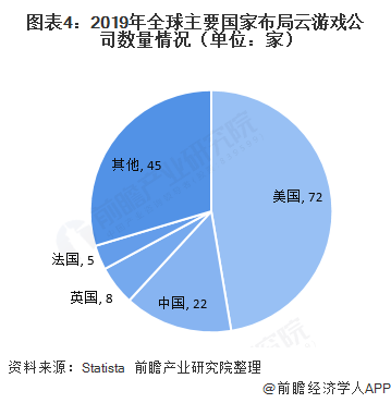 2018年起全球各大互联网企业纷纷布局云游戏市场。根据Statista公布的数据显示截至2019年9月,全球范围内进入云游戏行业的企业已经超过150家,其中美国72家,中国22家,英国8家,法国5家,其他国家合计45家。总体来说,云游戏市场仍以北美地区为主。