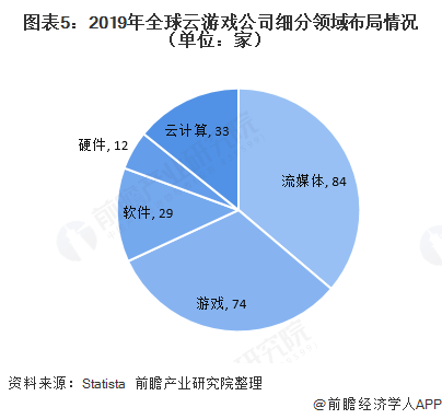 布局云游戏的公司相关业务大多分布于流媒体、云计算、软件&硬件、游戏等细分领域。其中流媒体领域吸引的公司较多,约占全部入局公司的52%,游戏领域吸引公司达74家,占比为49%。